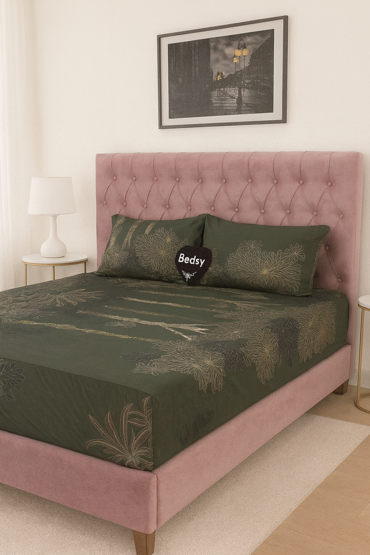 Bring elegance and style to your bedroom with our Premium Double Fitted Bed Sheet Set, featuring a sophisticated dark green floral pattern for a bold yet calming look.